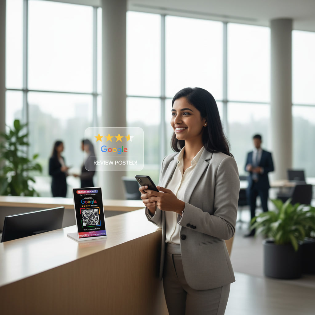 Customer scans the Digiwire Quick QR or taps the Quick NFC Card to open the review page instantly.