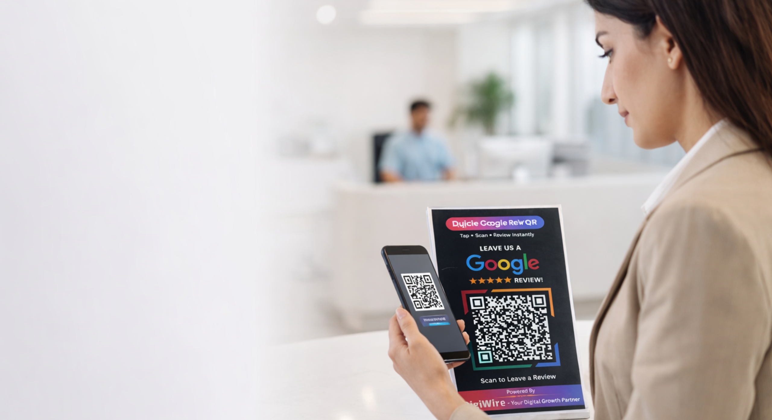 Customer scans the Digiwire Quick QR or taps the Quick NFC Card to open the review page instantly.